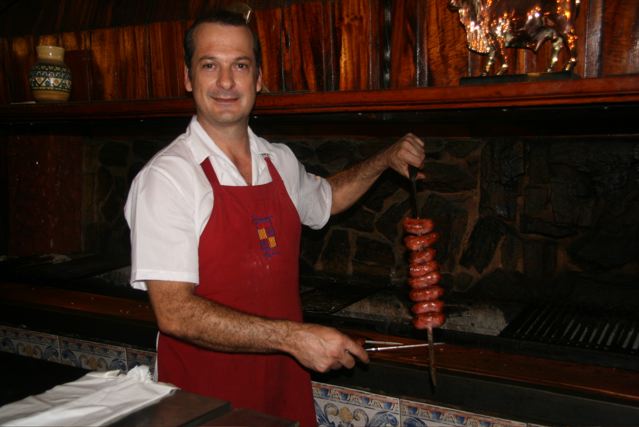 Oh, I guess it was lunch on Thursday when I went to the pleasant Churrascaria Majórica in Flamengo. These days, most churrascarias (churrasco refers to a southern Brazilian gaúcho/cowboy BBQ) feature the rodízio style (rodízio sort of means round and round, which is what the waiters with swords do) of serving, meaning never-ending supplies of meat on swords (really, just long skewers) parading around the room, flopping meat by endless request onto the plates of gluttonous diners (I should talk!).