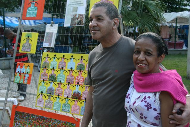 The other is a fellow named Vitorino who I met in 1999 when I bought a very large piece of his, maybe four feet by 3 feet. It is his version of the samba school Mangueira whose colors are green and pink.