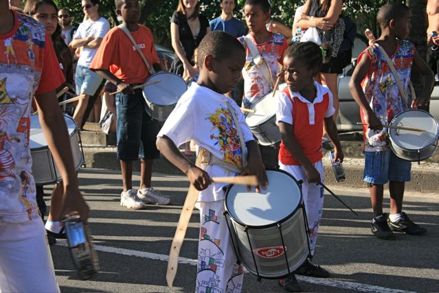 The sun was already low on the horizon, so my beach shots were not great, but I heard some drums from down the street and followed the sound to find a group of young kids playing samba drums, a bateria. The youngest were probably five or six, the oldest, maybe 11 or 12. I think it was part of a City of Rio project to get kids off the streets and involve them in something more than drug selling. They were great, lots of fun, and clearly loving what they were doing, though the youngest were just barely bigger than some of the drums. Check out the flickr photo link (More Photos) near the top of the page in the right hand column for more of these kids.