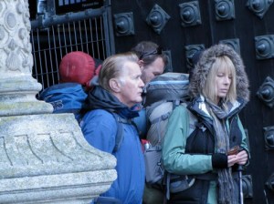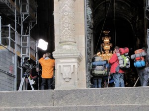 So, as Carlos continued to snore, I sojourned off toward the church (after getting my first cup of crappy coffee in Spain…all subsequent ones have been equally crappy, but more later). I went inside the church just in time because they soon thereafter roped off the stairway to further visitors since they were about to shoot the scene where Marty, as the Pilgrim, first walked through the door of the Cathedral at the end of his trek. I hovered about trying to get a good photo or two and managed to snap a couple that are ok. The wranglers or whatever you call them who police the film location were might vigilant about preventing too much activity too close to the action.