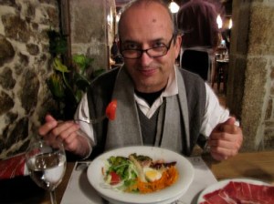 Now, all this leads me to the food in Santiago. Well, it mostly sucks. We have had 6 or 7 restaurant meals and finally, yesterday, we found one we want to return to. But more on that down the line. Galicia is known of it’s seafood, most of the seafood Madrid eats comes from here: clams, mussels, octopus (pulpo), many kinds of fish, razor clams, and of course, scallops. Remember the scallop shell is the symbol of the Caminho de Santiago (usually the Camino de, but I use the Portuguese spelling to be different, I suppose; the local Galego spelling is Camiño, but that is a “spanishized” spelling that derives from the time when Franco outlawed all the local dialects and tried to make them more Spanish, but that’s another blog entry).
