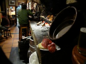 There was a fireplace at waist level with no screen and a small fire going right in the room. The owner used it as a trash can when she cleaned tables: tossed paper and other stuff right in. She included two pieces of cheese, and four pieces of bread topped with dry chouriço (see the foto here for the fire and the plate!) We’re gonna go back tonight. Another place we like is the Gato Negro right around the corner from the hotel.