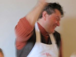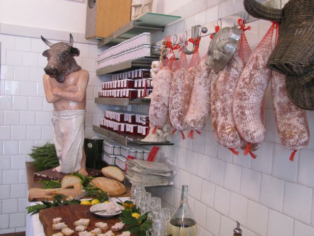 His butcher shop is across the street from the restaurant and it is sort of social center for residents and tourists in Panzano…he gives out generous samples of his meats, as well as bottomless glasses of his family’s wine. The restaurant is a relatively new development and features two seatings for dinner with a prix fixe meal/menu on three nights, and again for lunch on Sunday. It is a grand, merry affair in which Dario shows off his butchering skills with six courses of meat dishs…a few token vegetable dishes are thrown in for some weird reason! It’s all delicious.