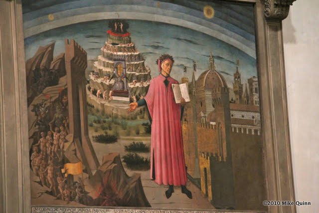 There are some interesting frescoes in the church: the one I love most it of Dante holding the Divine Comedy, standing a bit outside Florence (remember, he was in exile most of his adult life), showing the paths to heaven and hell as described in his monumental poetic opus.