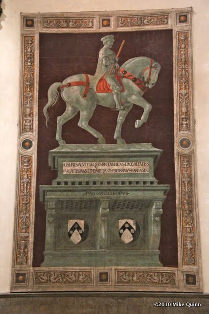 The other I like has a wonderful story behind it. It was painted by Paolo Uccello to celebrate the contribution of the English mercenary John Lockwood to the victory of Florence over one of its many foes. The story goes that he was promised a bronze statue in his honor if he would help Florence in its warring. The stingy Florentines had no intention of an actual statue, but rather, their joke was to create the work in painting. I have a feeling that this is just a legend since Lockwood spent many years in Florence fighting many wars, and was even named by England’s Richard II as an official representative to the Holy See. I still love the myth.
