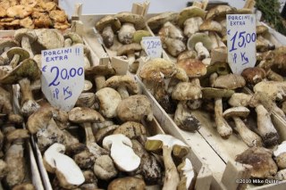 Then I wandered about the market looking at the amazing selection of cheeses, preserved/cured meats, fresh meats, spices, produce and mushrooms!!!! Porcini mushrooms are still in season since it’s been warm here, I may have mentioned this already. But I’m in wild mushroom heaven. I’ve had them twice as a passato at Cibreo (see the previous post), two or three times as a pasta condiment, and I can’t remember how else. Will seek out more here in Bologna. I’ve never had a mushroom as flavorful and texturally perfect as the porcino (singular of porcini, ok???  Panino is the singular of panini, please try to remember this!!!!). Hope they are still around this weekend when I hit the southern Tuscan town of Montalcino. Love ’em….