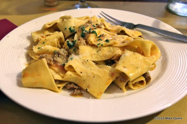 It really is just a hole in the wall, maybe 4 or 5 tables, 20 chairs, perhaps. I got there toward the end of their lunch period and shared a table with a couple of local dudes who shared not a single word with each other, and were very focused on their task of eating lunch and getting out. Ok, the menu was short, not many choices, but all interesting. So, Mr.-I-Can’t-Get-Enough-Lunch ordered wide, fresh pasta typical of Tuscany called pappardelle which was dressed with a duck ragú. The pasta itself was a bit thicker and tougher than the pasta I make at home, and thicker than pasta here in Bologna, but more on that anon. The sauce was tasty, but it really could have been any meat since the meat itself was practically pulverized. Still, a good dish.