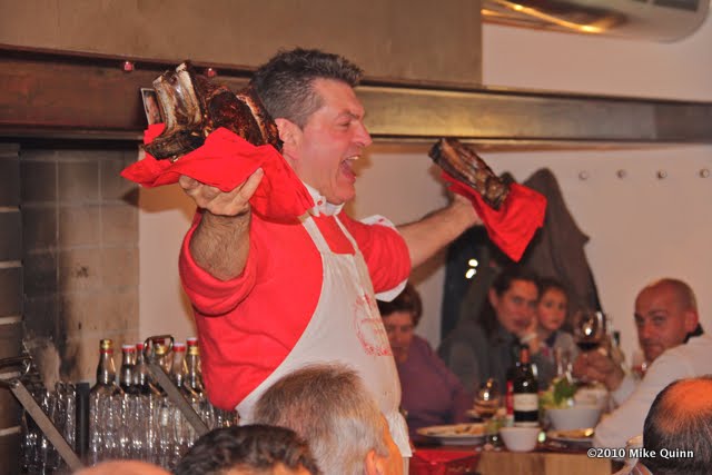 For part of this trip I was traveling with my friends Cosimo and Rebecca with whom, the year before,  I had visited Dario Cecchini’s amazing “restaurant” Solociccia (translated: Meat ONLY) located across the street from his now legendary butcher shop, the Antica Macelleria Cecchini in Panzano-In-Chianti, about halfway between Florence and Siena. (Here is my report from Solociccia in 2009 where I encountered Henry Winkler: click here.) For this 2010 trip we decided to try one of Dario’s other ventures into food service, his Officina della Bistecca (translated: Beefsteak Workshop), which was located atop the butcher shop overlooking the astonishing Chianti landscape surrounding the little village of Panzano. Like Solociccia, the menu at the Officina was only MEAT, but this time, the concentration was on different kinds of steak, and only from the fabled Tuscan breed of cow, the Chianina, which was once headed for extinction, but now making a healthy (if ending up on the supper table of well-to-do Italians and tourists is healthy!!!) comeback.