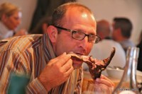 As the meat cooked, the level of conversation rose incrementally in anticipation of the arrival of the guests of honor, the Cecchini Selected Steaks. There were three different steaks served at this monumental meal, though each arrived pre-sliced on generously portioned plates which were passed around the tables—no entire slabs were served. First was a Costata alla Fiorentina which is basically a bone-in rib eye—exquisite, bloody rare and unforgettable.  Next was a special cut Dario calls the Bistecca Panzanese (Panzano Steak) which is a muscle taken from the heart of the cow’s thigh—European butchers are far more expert at extracting the tender muscles from their sides of beef, and this was no exception. It was tender, beefy flavored and totally unobtainable from the standard American butcher counter. Lastly the Grill Master brought in the legendary Bistecca Fiorentina, a three to four pound porterhouse, cooked very rare, al sangue.