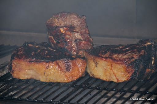 In the meantime, the stocky dude kept lugging more boards laden with more steaks, chops and who knows what. I was curious to see the cooking process, so I followed him out to the grill to observe his technique. The fire was hot, but not across the entire grill, so he was able to move the meats around to adjust the cooking speed for each one. But it was not just one grill, but two large ones, each divided into four or five grilling areas, and each grill was also height-adjustable to help with the temperature control. Very impressive. And remember, he was using wood, not charcoal.
