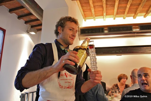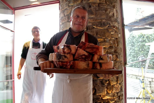 The Officina is offered a few nights per week, plus Sunday afternoon which was the time slot we chose. So late on a gray Sunday morning, we grabbed a bus from Florence to Panzano—just a few miles as the crow flies—but an hour, at least, by bus negotiating the winding roads meandering through the Chianti hillsides. Upon arriving, maybe 45 minutes early, we entered the butcher shop which has turned into a rather animated and amusing meeting spot for locals and tourists alike, most of whom are there to eat in one of Dario’s meat palaces. The first thing that happens as you enter the shop is someone hands you a glass, then fills it with ruby red Chianti, smiling broadly with a distinctly small town welcome. Yeah, Baby, this is the way to live!