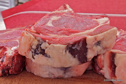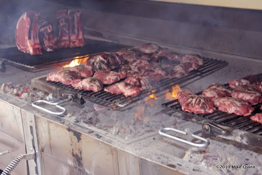 In the meantime, the stocky dude kept lugging more boards laden with more steaks, chops and who knows what. I was curious to see the cooking process, so I followed him out to the grill to observe his technique. The fire was hot, but not across the entire grill, so he was able to move the meats around to adjust the cooking speed for each one. But it was not just one grill, but two large ones, each divided into four or five grilling areas, and each grill was also height-adjustable to help with the temperature control. Very impressive. And remember, he was using wood, not charcoal.