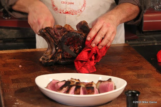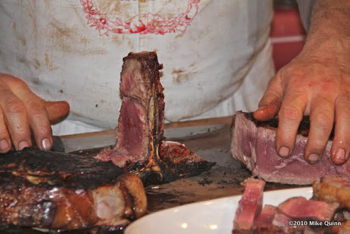 For part of this trip I was traveling with my friends Cosimo and Rebecca with whom, the year before,  I had visited Dario Cecchini’s amazing “restaurant” Solociccia (translated: Meat ONLY) located across the street from his now legendary butcher shop, the Antica Macelleria Cecchini in Panzano-In-Chianti, about halfway between Florence and Siena. (Here is my report from Solociccia in 2009 where I encountered Henry Winkler: click here.) For this 2010 trip we decided to try one of Dario’s other ventures into food service, his Officina della Bistecca (translated: Beefsteak Workshop), which was located atop the butcher shop overlooking the astonishing Chianti landscape surrounding the little village of Panzano. Like Solociccia, the menu at the Officina was only MEAT, but this time, the concentration was on different kinds of steak, and only from the fabled Tuscan breed of cow, the Chianina, which was once headed for extinction, but now making a healthy (if ending up on the supper table of well-to-do Italians and tourists is healthy!!!) comeback.