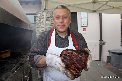 Thanks, James…I've edited the post to answer your questions: 1) They do not deliver entire steaks to the table, each is lovingly sliced and plates heaped with those slices are placed around the table…one may eat as much as one likes…as long as the supply hold out. The tastes are not necessarily modest! 2) The cost is 50 Euros, about seventy five bucks, a bargain considering the quality, quantity and the unique nature of the experience. That price includes everything: food, wine, water (bubbly or still), coffee, dessert, after dinner liqueurs…no tipping!